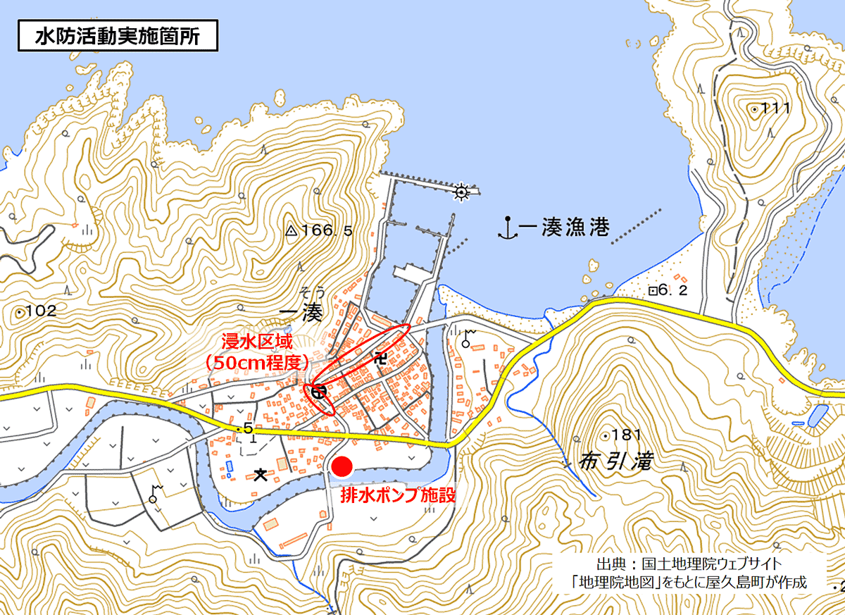 集落中心部が床下浸水等の被害を受ける危険な状況の中、住宅基礎の低い家屋への土のう積み、住民の避難誘導、排水施設の運転及びポンプ車による排水作業等を行い、人的被害の軽減のため活動した。